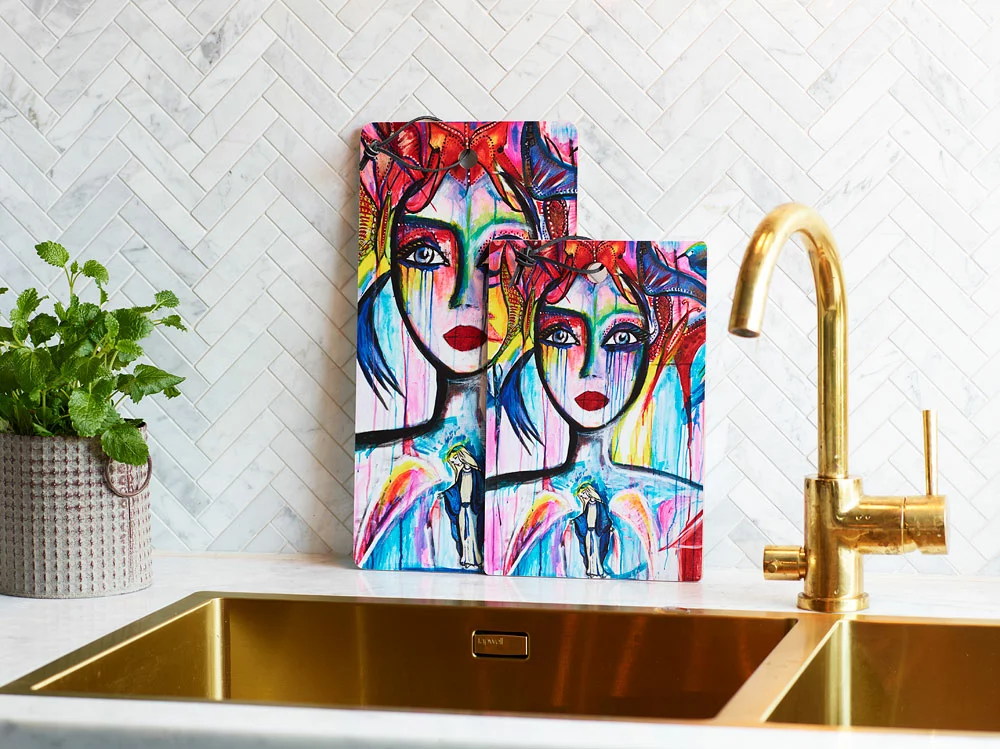 Snijplank van Carolina Gynning. Een kleurrijke snijplank met het populaire ‘Slice of Life’-motief. Het is een leuk detail in de keuken, ook als het niet wordt gebruikt. Het is gemaakt van hout met een beschermend melamine oppervlak. Mag niet in de vaatwasmachine worden gewassen.